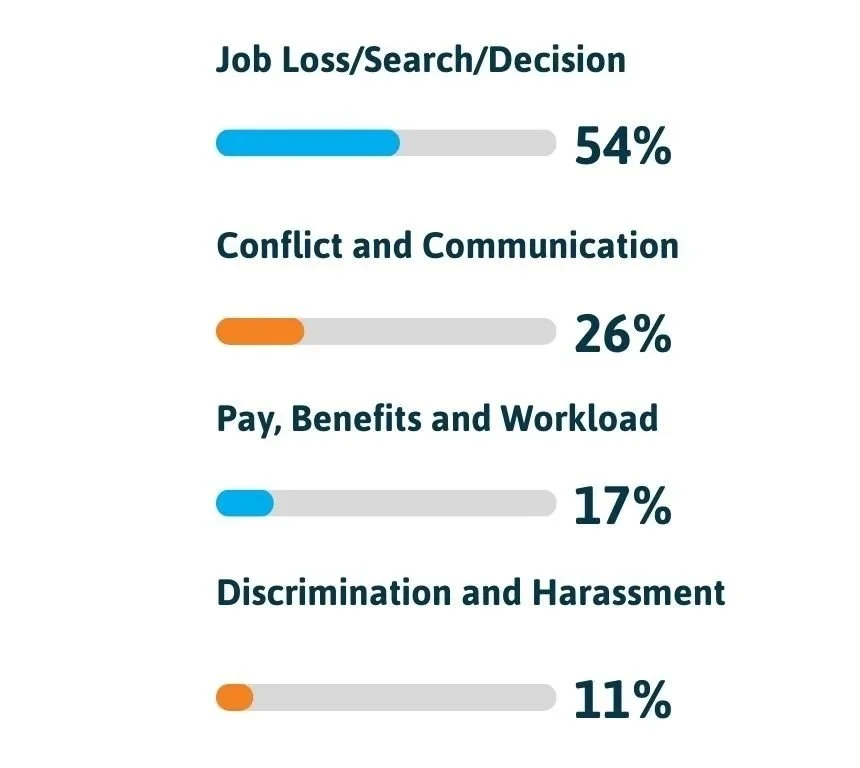 Beyond job search issues, we saw continued high volumes of outreach related to workplace dynamics, including manager and leadership challenges, work-life balance concerns, and conflicts with coworkers.